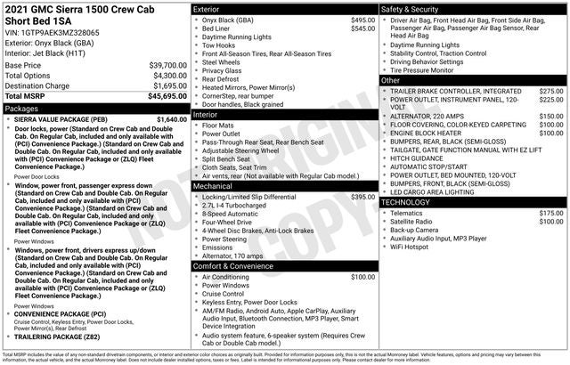 The Sierra Value Package, Convenience Package, and Trailering Package further enhance the capabilities of this vehicle, offering features like the integrated trailer brake controller, 220-amp alternator, and auto-locking rear differential. The Onyx Black exterior with gloss black 20-inch wheels gives the Sierra 1500 Base a bold, confident look that commands attention on the road.
