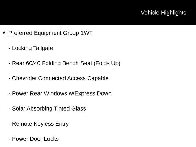 - Tailgate, locking, utilizes same key as ignition and door (Upgraded to (QT5) EZ Lift power lock and release tailgate when (PCV) WT Convenience Package or (ZLQ) WT Fleet Convenience Package is ordered. Not available with (ZW9) pickup bed delete.)